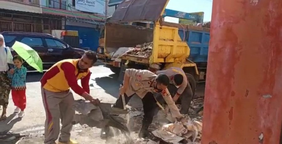 Dengan penuh kekompakan Wakapolres bersama para personil bahu membahu membersihkan berbagai material yang ada.