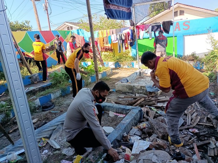 Puluhan perwakilan personil Polres Gowa dan Polsek dataran rendah melakukan kerja bakti di TK Kemala Bhayangkari Polres Gowa pada Kamis (3/6/2021).