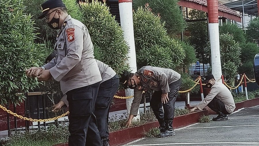 Pasca apel pagi pejabat utama, perwira dan personel serta AAN langsung menuju sektor atau lokasi kemudian membersihkan sampah dan merapikan tanaman.