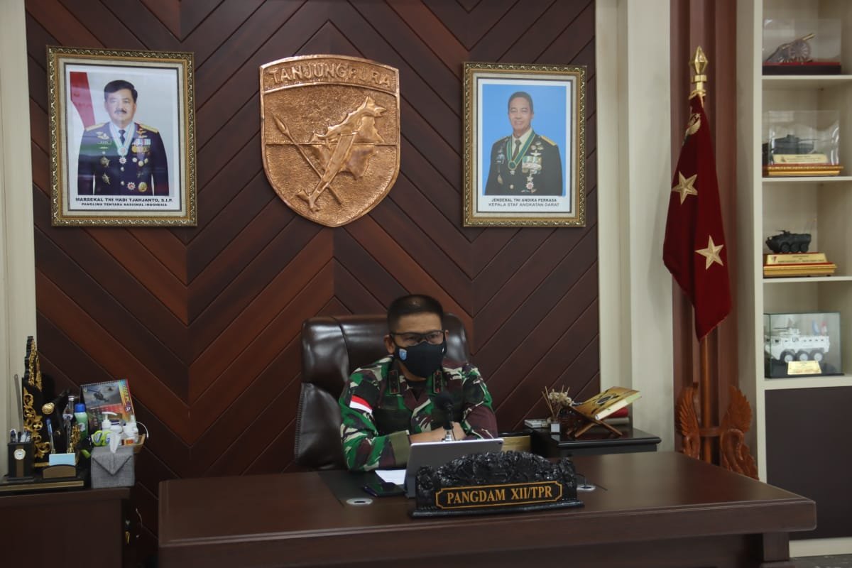Panglima Kodam XII/Tanjungpura (Tpr), Mayjen TNI Muhammad Nur Rahmad mengikuti webinar "Bincang-bincang Forum Komunikasi Pimpinan Daerah dengan Para Pamong Desa dari ruang kerjanya di Gedung A Makodam XII/Tpr.