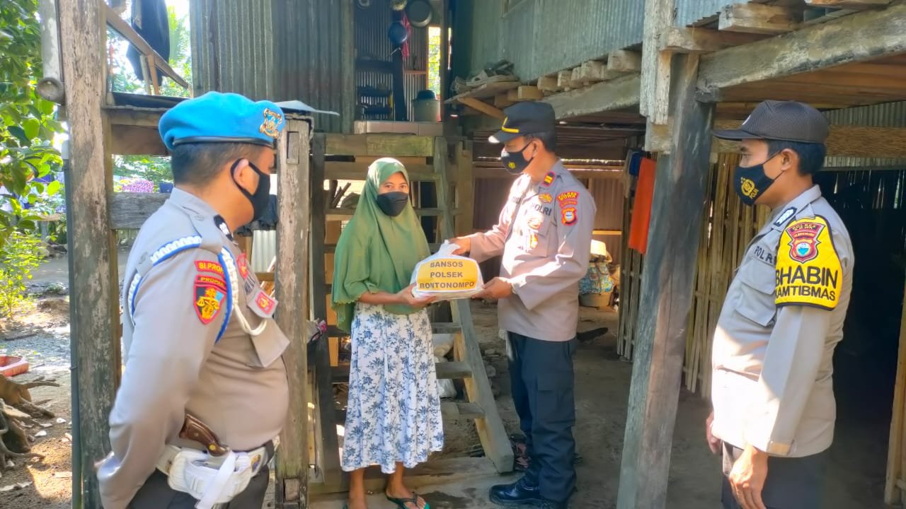 Sebanyak 4 kepala keluarga di sekitar kantor polsek bontonompo mendapat bantuan bingkisan sembako dari polsek bontonompo.