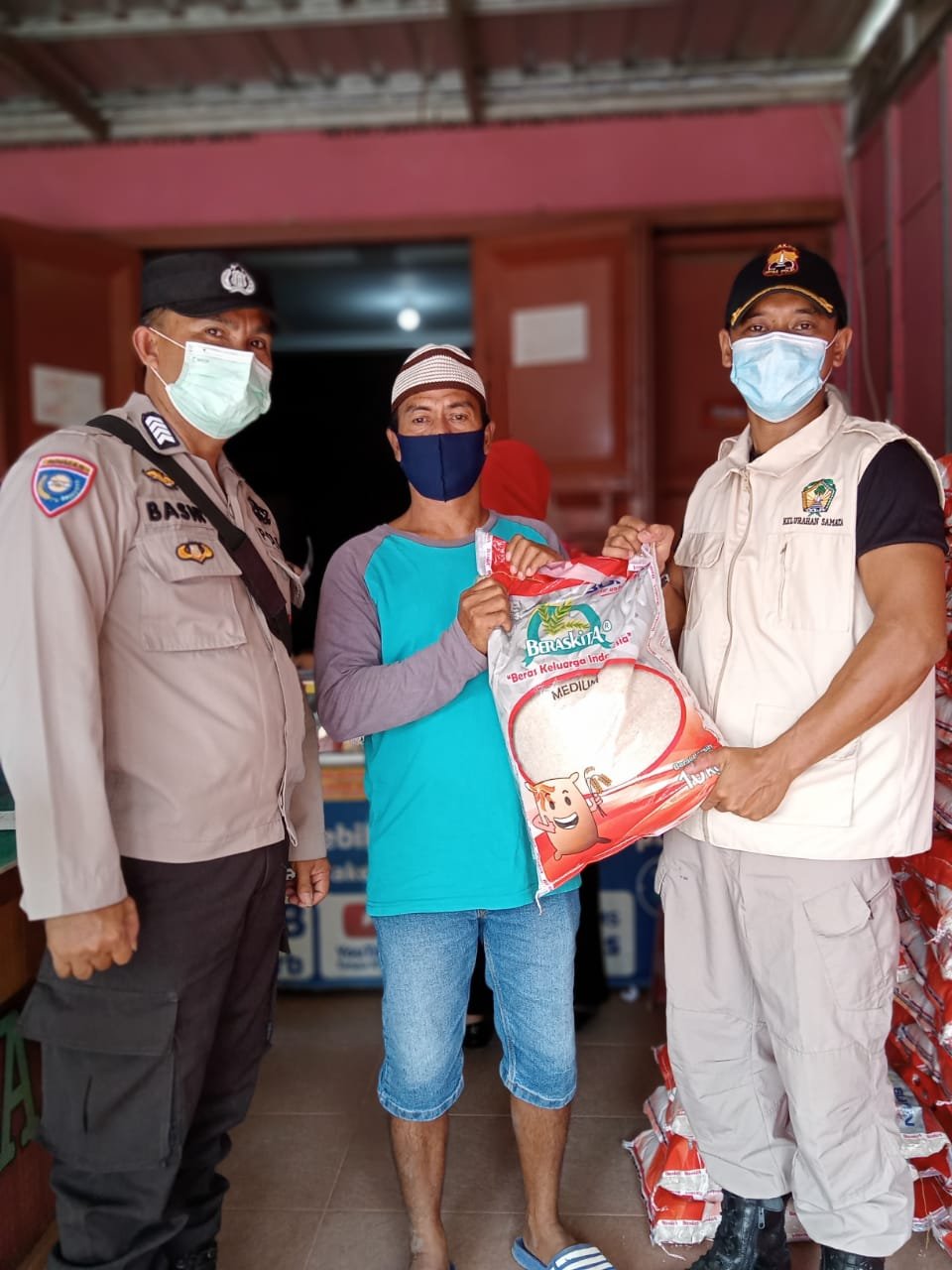 Lurah samata Faizal Ichwan Azali S,Stp, Babinsa Pelda Mattoreang dan Bhabinkamtibmas Bripka Basir yang selalu bersinergi disetiap adanya kegiatan bansos di wilayahnya demi keamanan dan kenyamanan warganya.