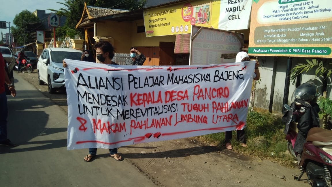 Aksi Demo yang dilakukan oleh Aspirasi Pelajar dan Mahasiswa Bajeng (APMB) terkait kondisi tugu pahlawan yang berada di samping Kantor Desa Panciro ini, dibiarkan terbengkalai oleh pemerintah.