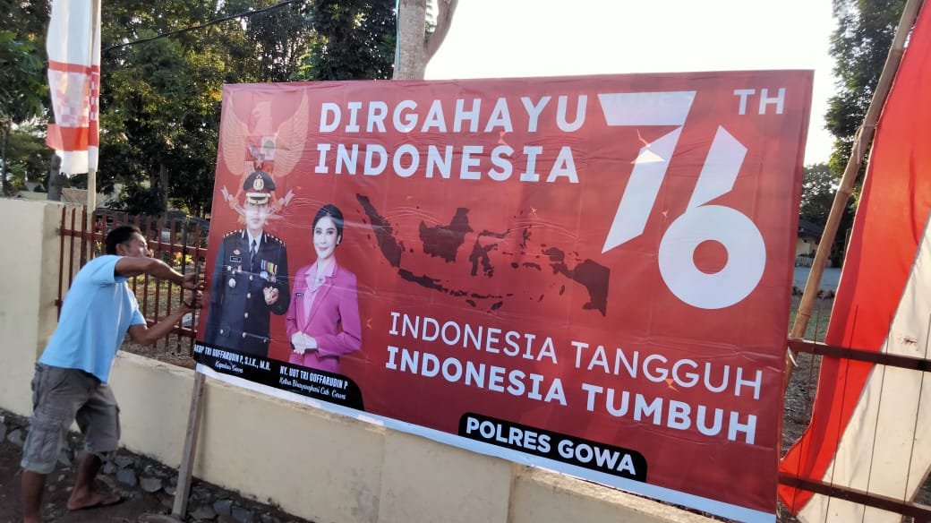 Terlihat jelas pada Spanduk kemerdekaan Republik Indonesia yang ke 76 Gambar Kapolres Gowa AKBP Tri Goffaruddin P SIK MH di dampingi ketua Bhayangkari Polres Gowa Ny Uut P Tri sebagai bentuk penghormatan kepada para pahlawan yang rela berkorban jiwa dan raganya dalam memperjuangkan Kemerdekaan Indonesia.