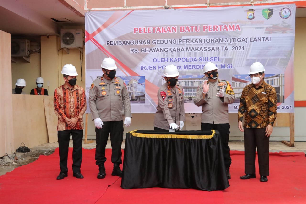 Kapolda Sulsel Irjen Pol Drs . Merdisyam meletakan batu pertama dimulainya pembangunan Gedung Perkantoran berlantai tiga RS Bhayangkara Makassar, Jumat 27 Agustus 2021.