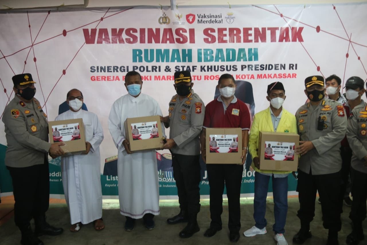 Setiba di Gereja Paroki Maria Ratu Rosari Kota Makassar Wakapolda dan rombongan disambut para pastor gereja tersebut dari keterangan yang diperoleh, giat Vaksinasi Massal dilokasi tebut ditargetkan sebanyak 1000 dosis.