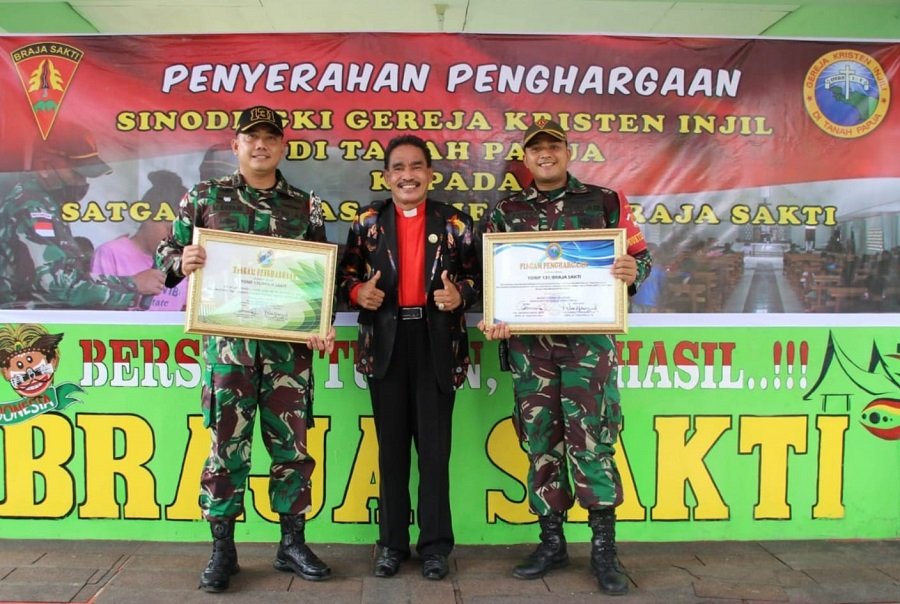 Dansatgas mengatakan, ucapan terima kasih kepada pihak Sinode Gereja Kristen Injil di tanah Papua yang telah memberikan 2 buah penghargaan sekaligus kepada Satgas 131/Brs atas pengabdian TNI dalam menciptakan situasi keamanan, ketertiban dan juga memberikan pelayanan di bidang keagamaan, kesehatan terpadu, pendidikan, peningkatan perekonomian rakyat dan kegiatan kemanusiaan lainnya bagi masyarakat wilayah perbatasan di Papua.