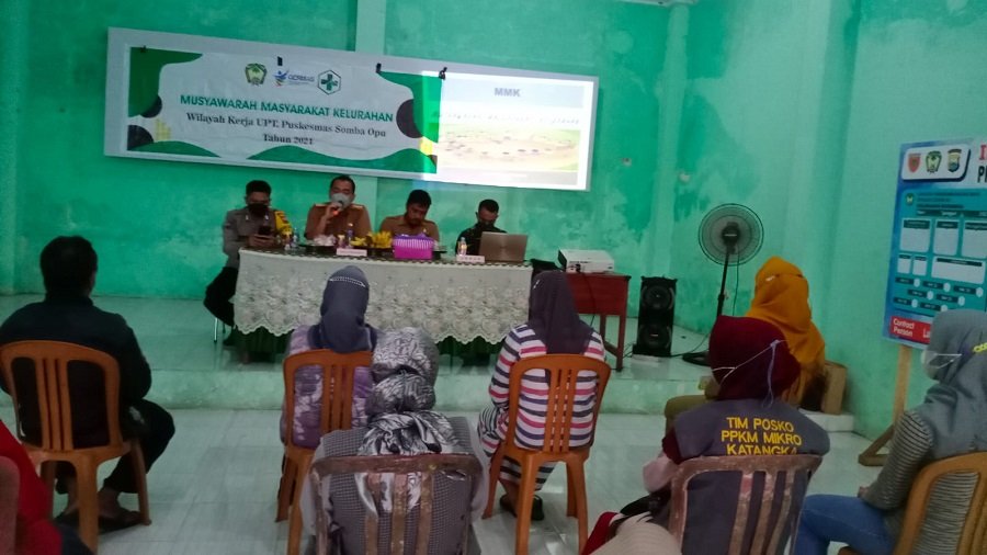 Bhabinkamtibmas Kel Katangka Polsek Somba opu gowa Bripka Muh Arafah menghadiri rapat Musyawarah Masyarakat Kelurahan Wilayah Kerja UPT Puskesmas Somba Opu tahun 2021.