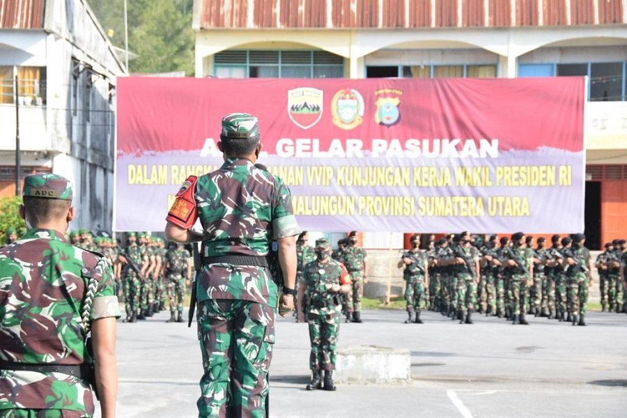 Pangdam I/BB Mayjen TNI Hasanuddin bersama Kapolda Sumut Irjen Pol Drs. RZ Panca Putra Simanjuntak, MSi memimpin apel gelar pasukan Pengamanan VVIP dalam rangka kunjungan kerja Wakil Presiden RI Ma'ruf Amin beserta Ibu Hj. Wury Ma’ruf Amin, di Terminal Sosorsaba Parapat, Kamis (09/12/2021).