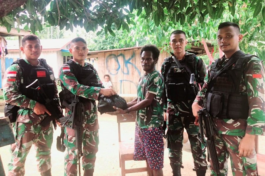 Untuk membantu meringankan kebutuhan masyarakat, Satgas Pamtas RI-PNG Yonif 126/KC membagikan paket sembako kepada warga di perbatasan Kampung Umuaf, Kabupaten Keerom, Papua.