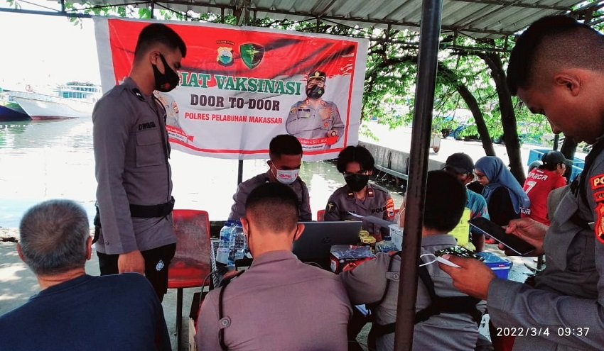Vaksinasi nasional terus digencarkan Polres Pelabuhan Makassar di wilayah hukumnya untuk memutuskan penyebaran virus Covid-19, Jum'at (04/03/2022).