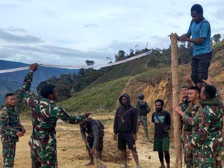 Bertugas di daerah pedalaman Papua, Prajurit Satgas Yonif MR 412 Kostrad terus tingkatkan solidaritas bersama masyarakat melalui berbagai kegiatan yang bermanfaat. Kali ini Prajurit Satgas dari Pos Popome bersama masyarakat Desa Popome bangun sarana olahraga lapangan bola volly di Desa Popome, Distrik Mokoni, Kabupaten Lanny Jaya, Papua.