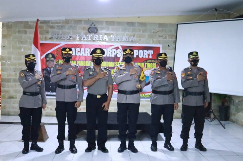 Kapolres Pelabuhan Makassar AKBP Yudi Frianto memimpin upacara Korps Raport Kenaikan Pangkat Pengabdian di Aula Patria Tama Mapolres tersebut, Kamis (28/04/2022).