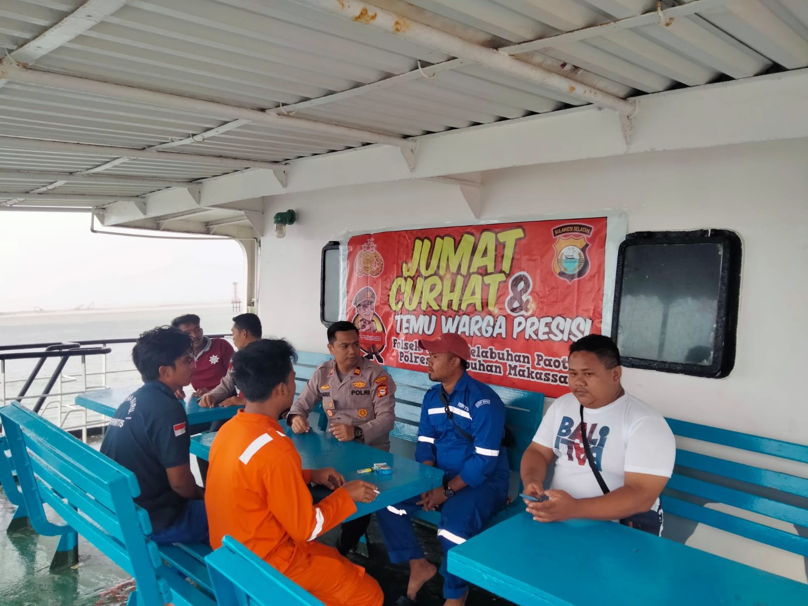 Dengar curahan hati warga sekitar dan Nahkoda kapal serta ABK, Kapolsek Kawasan Paotere Iptu Hasrul menggelar Jumat Curhat di atas Kapal Perintis di Dermaga 10 Pelabuhan Paotere Kota Makassar, Jumat (17/02/2023).