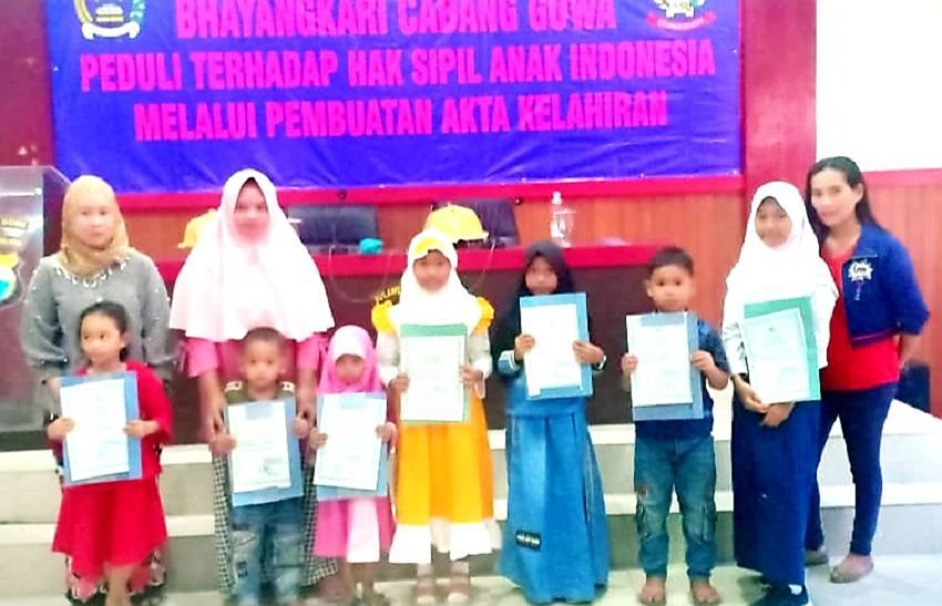 Aksi peduli itu dilakukan dalam bentuk pemberian fasilitas pembuatan akte kelahiran gratis untuk anak-anak dari keluarga prasejahtera, yang diserahkan langsung oleh pengurus Bhayangkari Cabang Gowa.