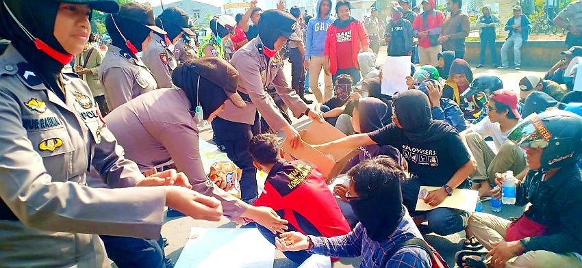 Dengan penuh senyuman, para personil Polwan ini pun turun langsung menghampiri dan memberikan para pengunjuk rasa ini permen dan air minum.