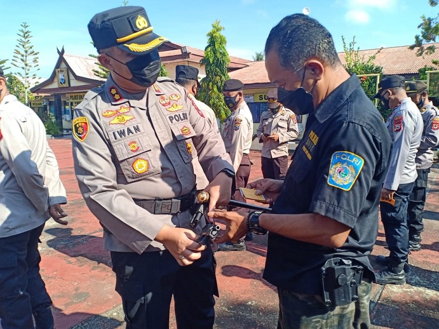 Kepala Kepolisian Resor (Kapolres) Sinjai Ajun Komisaris Besar Polisi (AKBP) Iwan Irmawan didampingi Wakapolres Sinjai Kompol Joko Sutrisno dan para Kabag serta Kasi Propam AKP Muh. Nasir melakukan pemeriksaan senpi yang dipinjam pakaikan kepada anggota setelah pelaksanaan apel pagi, bertempat di Halaman Mapolres Sinjai. Kamis (21/10/2021) pagi.