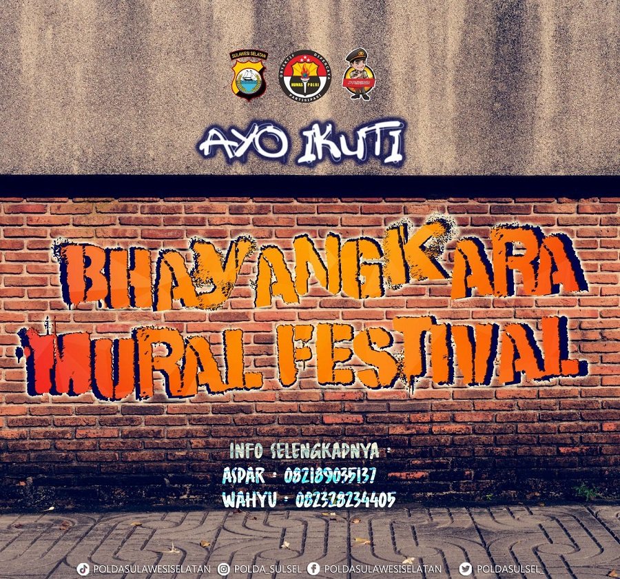 Polda Sulsel akan menggelar festival atau lomba seni mural Piala Kapolri 2021, yang rencananya bakal diselenggarakan pada 30 Oktober 2021 di Jl Penghibur Makassar. Acara itu mengusung tema 'Peran Generasi Muda Untuk Berkreasi Dalam Menyampaikan Informasi Yang Positif di Masa Pandemi Covid-19'.