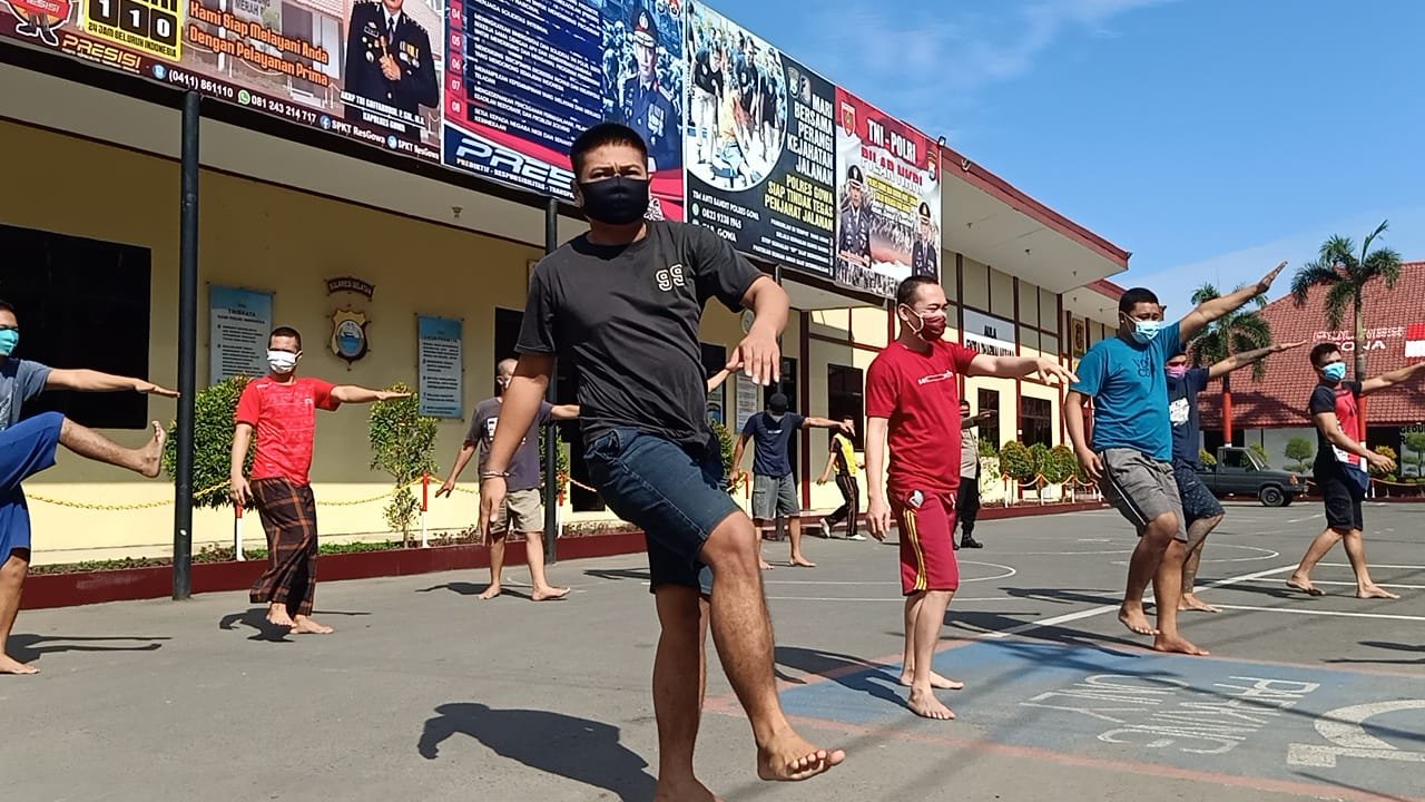 Sebanyak 32 tahanan yang ada di rutan Polres Gowa menggelar olahraga bersama di halaman kantor Polres Gowa pada Kamis (29/7/21).