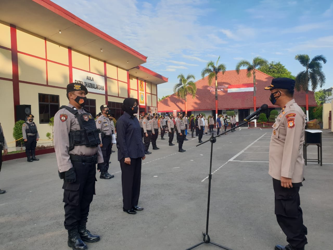 Wakapolres Gowa KOMPOL Soma Miharja, S.Sos., MM, tunjuk langsung anggota sebagai pengucap Tri Brata dan Catur Prasetya saat memimpin apel pagi yang bertempat dihalaman Mako Polres Gowa. Kamis (29/07/21).
