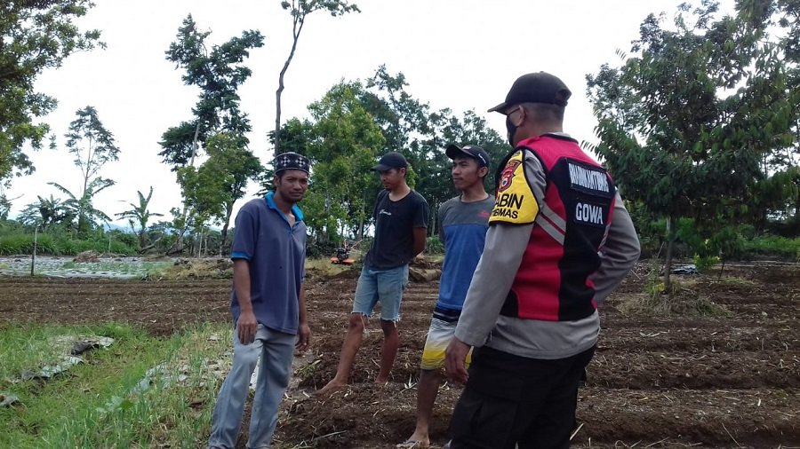 Dalam menjaga Kamtibmas dan mencegah penularan Covid-19 di wilayah binaannya, Bhabinkamtibmas Polsek Tompobulu Polres Gowa Aipda Makmur menemui para petani Di Desa Tanete Sabtu (10/04/21).
