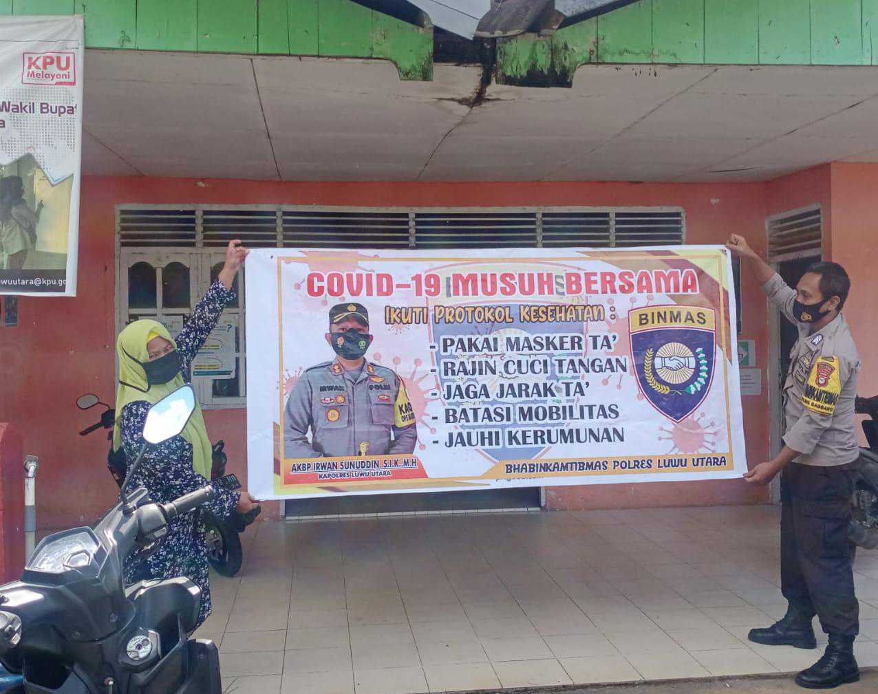 Dalam rangka peduli dengan kesehatan masyarakat dan mendukung pemerintah serta Komando dari Kapolri demi mencegah sebaran wabah Virus Covid-19 yang kian bertambah di Kabupaten Luwu Utara (Lutra) Sulawesi Selatan (Sulsel), Bhabinkamtibmas Bripka Aswadi mengimbau masyarakat binaannya di empat desa Kecamatan Sabbang Selatan dengan memasang spanduk himbauan, Kamis (25/2/2021).