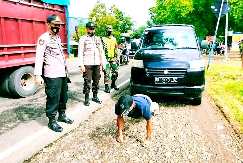 Personel Polsek Bontonompo Polres Gowa bersama anggota Koramil 1409-08 Bontonompo melaksanakan kegiatan Operasi Yustisi penggunaan masker, Senin (15/02/2021).