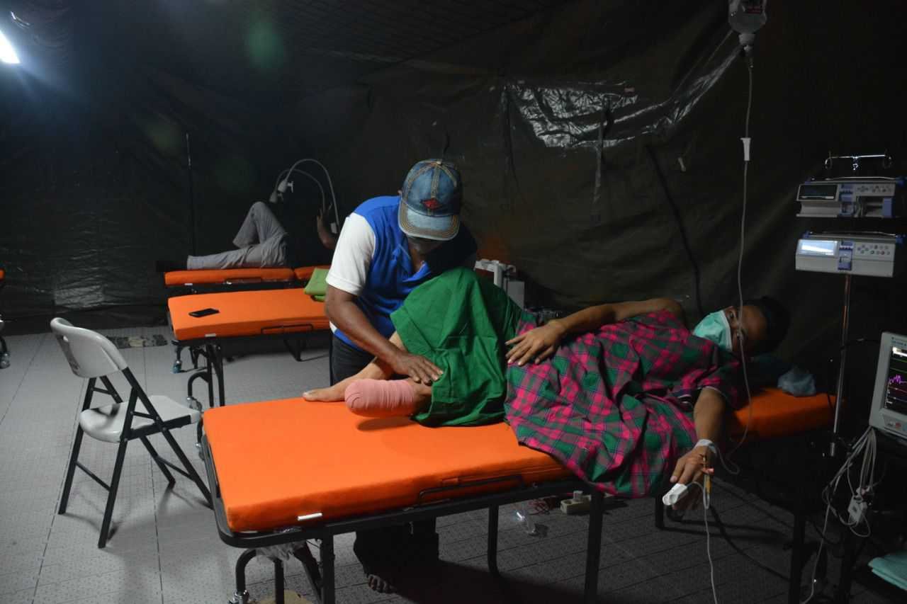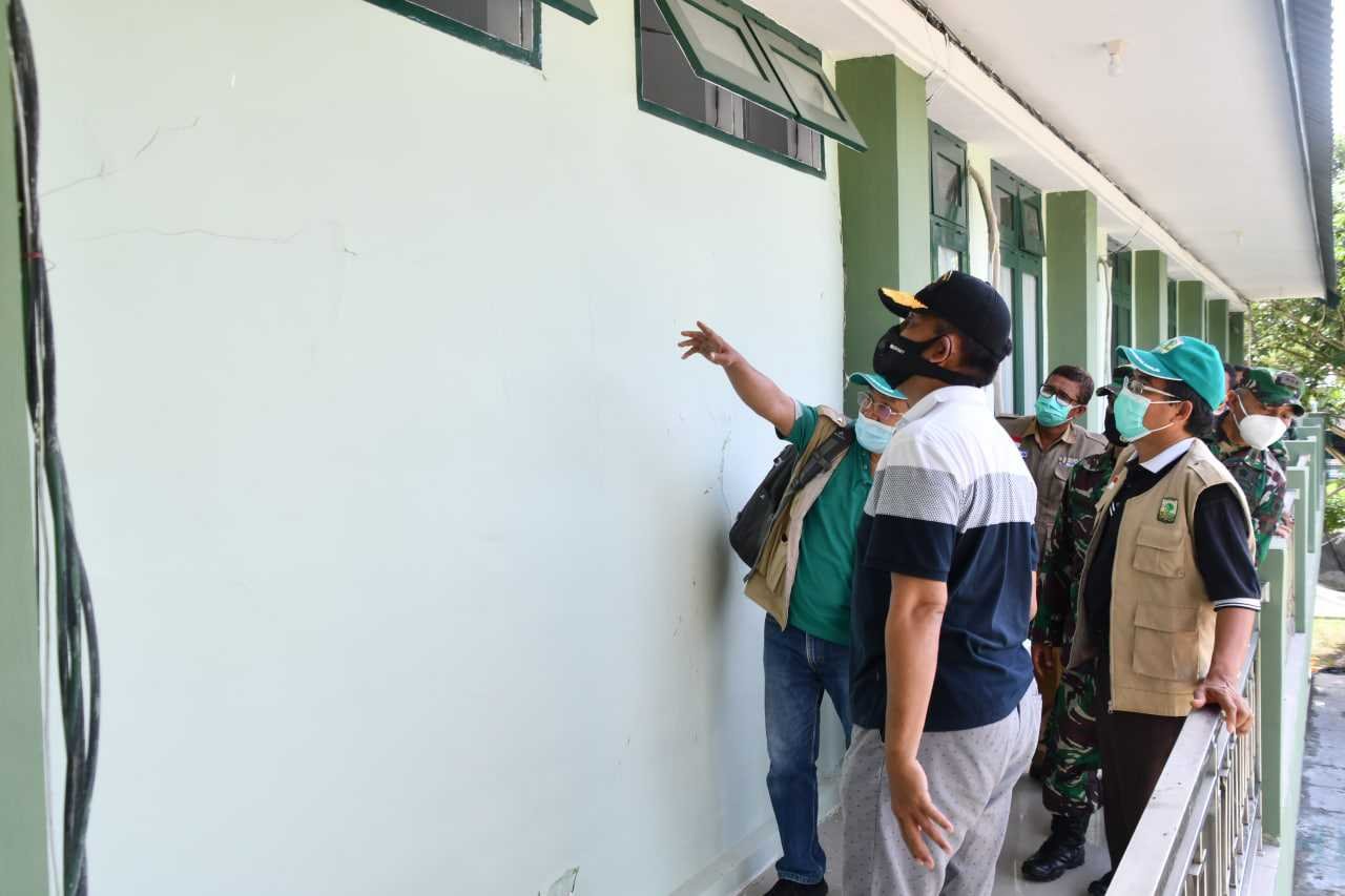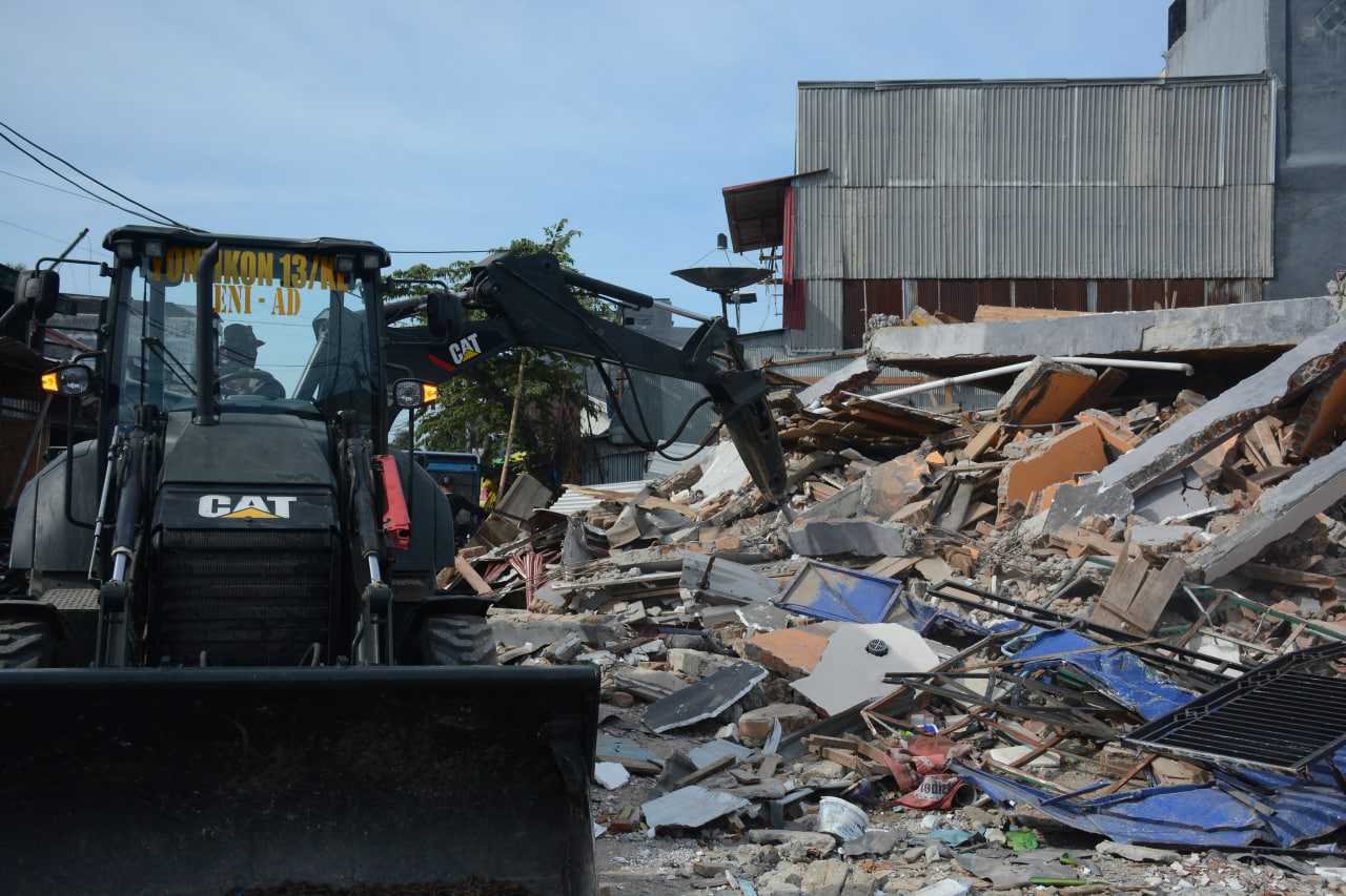 Pasca gempa bumi di Mamuju dan Majene, TNI AD dalam hal ini Batalyon Zeni Konstruksi (Yonzikon) 14/SWS Menzikon Pusziad membantu membersihkan puing-puing rumah warga yang roboh dengan menggunakan alat berat TNI AD, Rabu (10/2/2021).