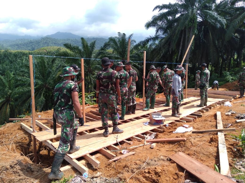 Dandenzibang 2/XIV Hasanuddin Letkol Czi Satar Budiharianto memimpin personel TNI pembuatan MCK Lapangan di lokasi pengungsian banjir bandang, Sabtu (18/7/2020).