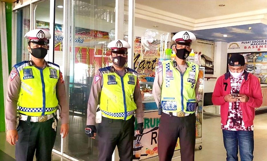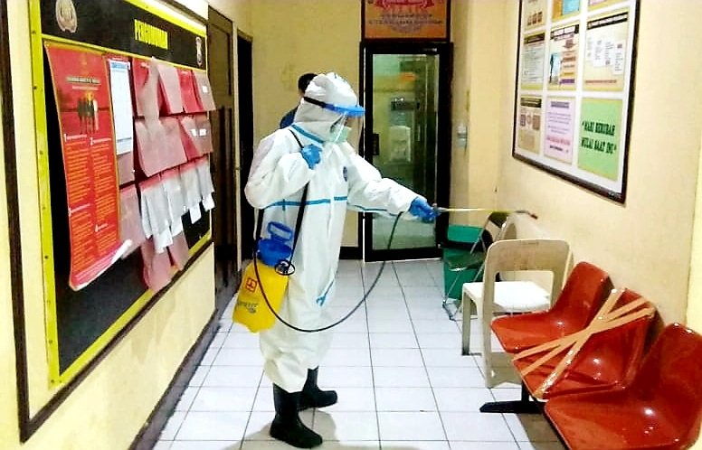 Untuk mencegah merebaknya Covid-19, Urkes Polres Pelabuhan Makassar melakukan penyemprotan cairan disinfektan di lingkungan Mapolres, Selasa (14/07/2020).