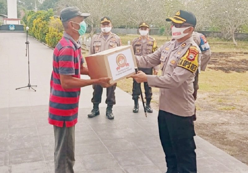 Dalam rangka menyambut Hari Bhayangkara ke-74, Kapolres Gowa AKBP Boy FS Samola, SIK, MH berikan bantuan sembako kepada seorang penjaga dan juru kunci di Taman Makam Pahlawan (TMP) Kecamatan Bontomarannu ditengah-tengah pelaksanaan upacara dan tabur bunga, Senin (29/06/2020).