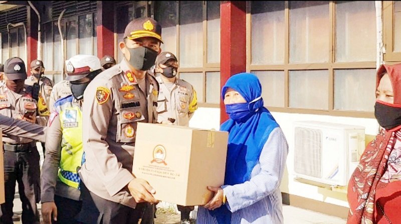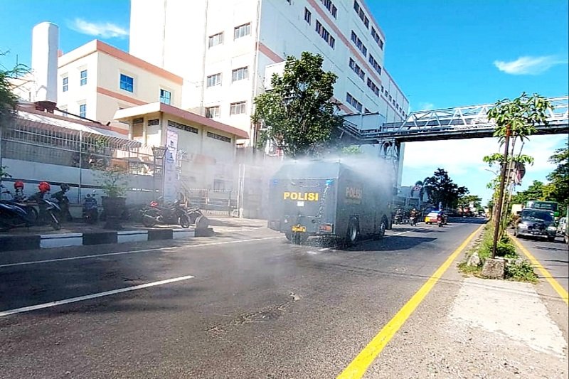 Puluhan personil gabungan melakukan sterilisasi sejumlah titik di Kota Makassar menggunakan cairan disinfektan. Polres Pelabuhan pun mengerahkan kendaraan taktis Water Canon dalam melakukan penyemprotan disinfektan.