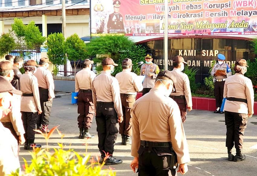 Pasca melaksanakan apel pagi, personil Polres Gowa menyisihkan sedikit rejekinya dengan mengisi kotak amal di halaman Mako Polres Gowa, Kamis (02/04/2020).