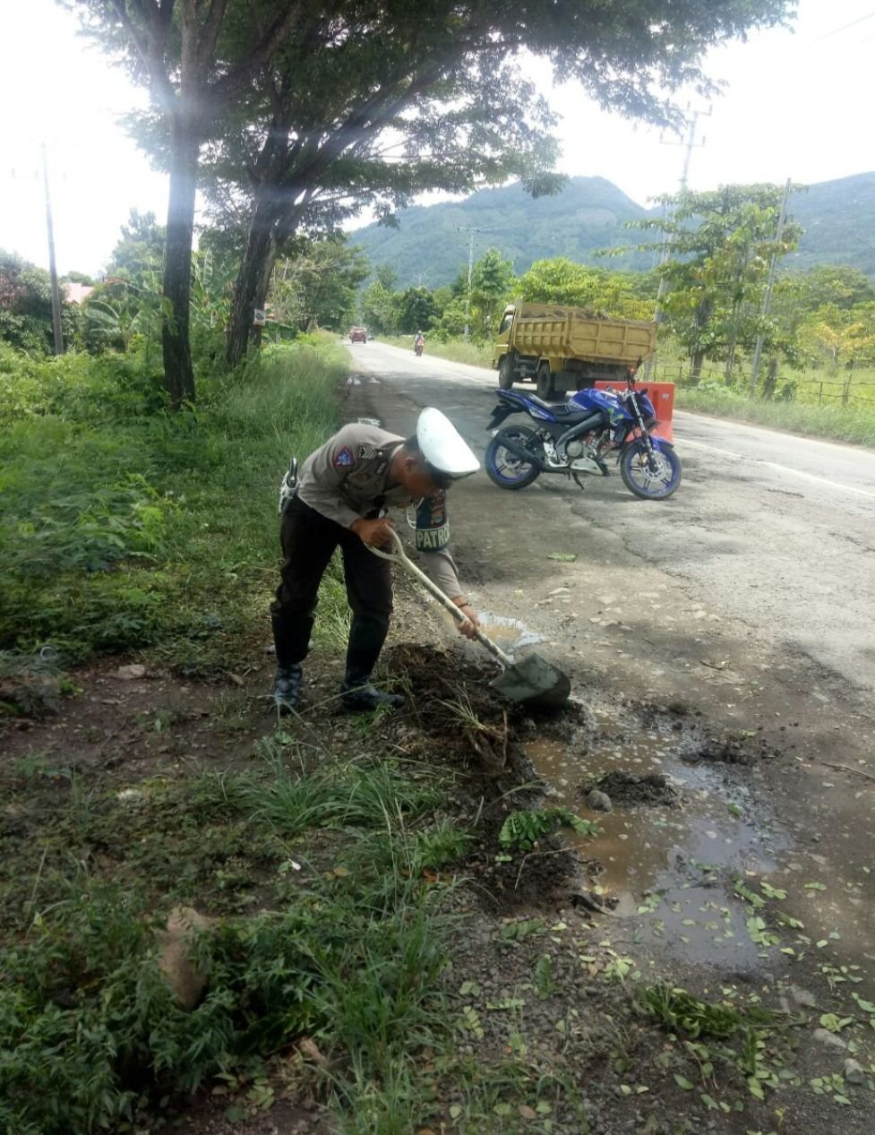 Satuan Lalu Lintas Polres Luwu, Personel Polsek Bua, bersama masyarakat di Desa Karang-Karangan, menambal jalan Trans Sulawesi, poros Bua-Belopa, Minggu (1/3/2020) pagi.