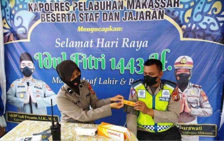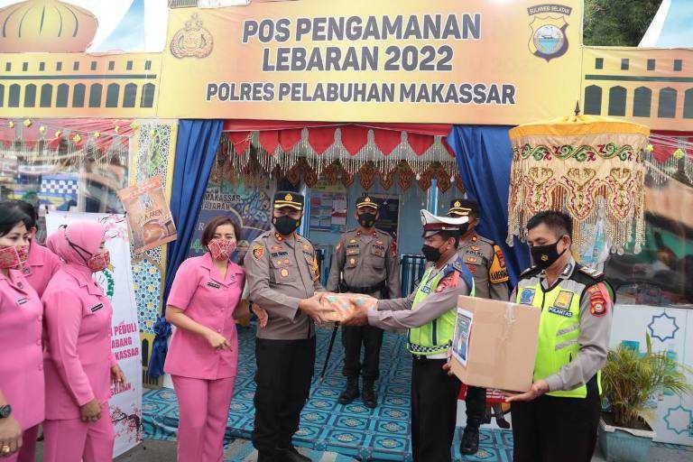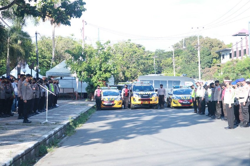 Kepolisian Resor (Polres) Pelabuhan Makassar menggelar Apel Siaga dalam rangka patroli pemantauan takbir keliling dan pengamanan malam takbiran pada malam Idul Fitri 1443H/2022M di depan Mapolres tersebut, Minggu (01/05/2022).