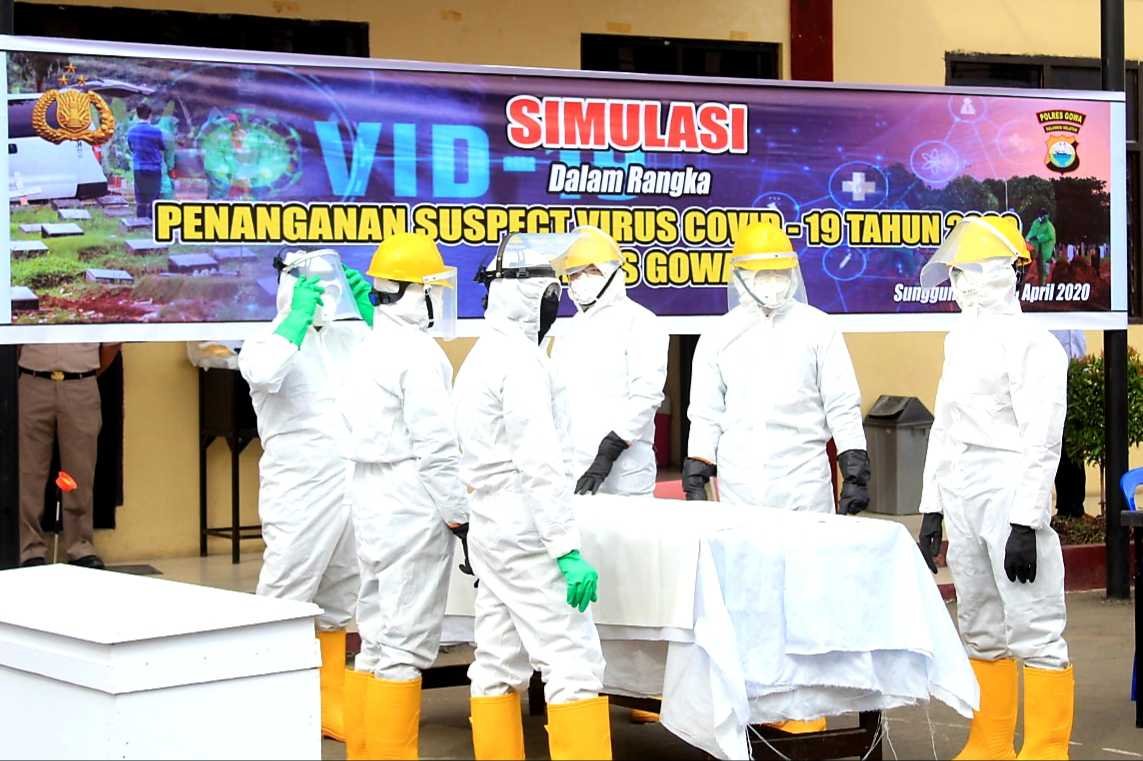Polres Gowa pada Kamis (16/04/2020) pagi tadi menggelar simulasi penanganan Covid-19 di halaman apel Polres Gowa.
