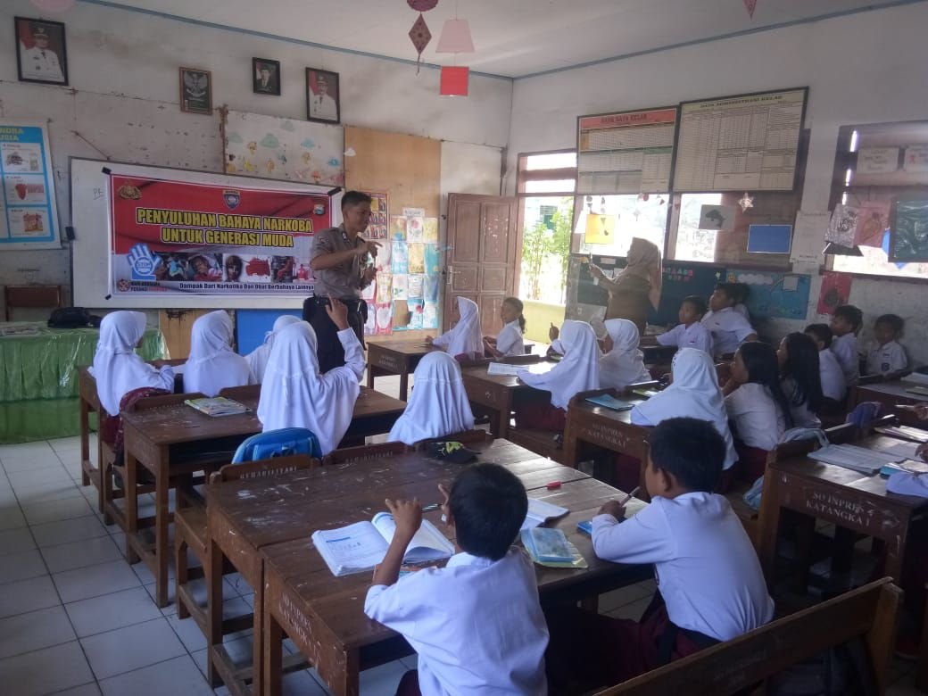 Bhabinkamtibmas Kelurahan Katangka Polsek Somba Opu Polres Gowa, Bripka M. Arafah sangat intens lakukan penyuluhan bahaya narkoba dan miras di wilayah binaannya seperti yang dilakukan Senin (24/2/2020) pagi, menyasar anak-anak sekolah di SD Inpres Katangka 1, Kelurahan Katangka, Kecamatan Somba Opu.