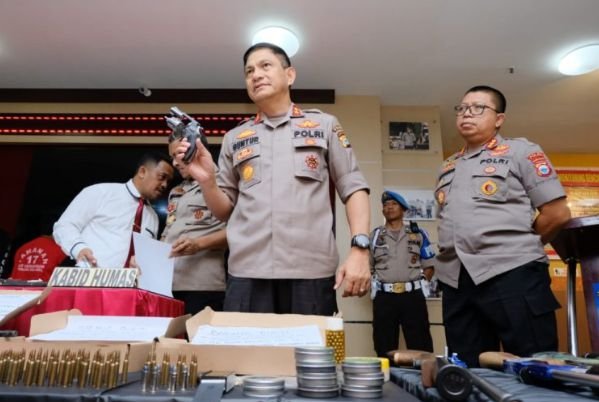 Kapolda Sulsel Irjen Pol. Mas Guntur Laupe memimpin Press Release pengungkapan kasus perdagangan Senjata Api di Mapolda, Makassar, Senin (17/2/2020)