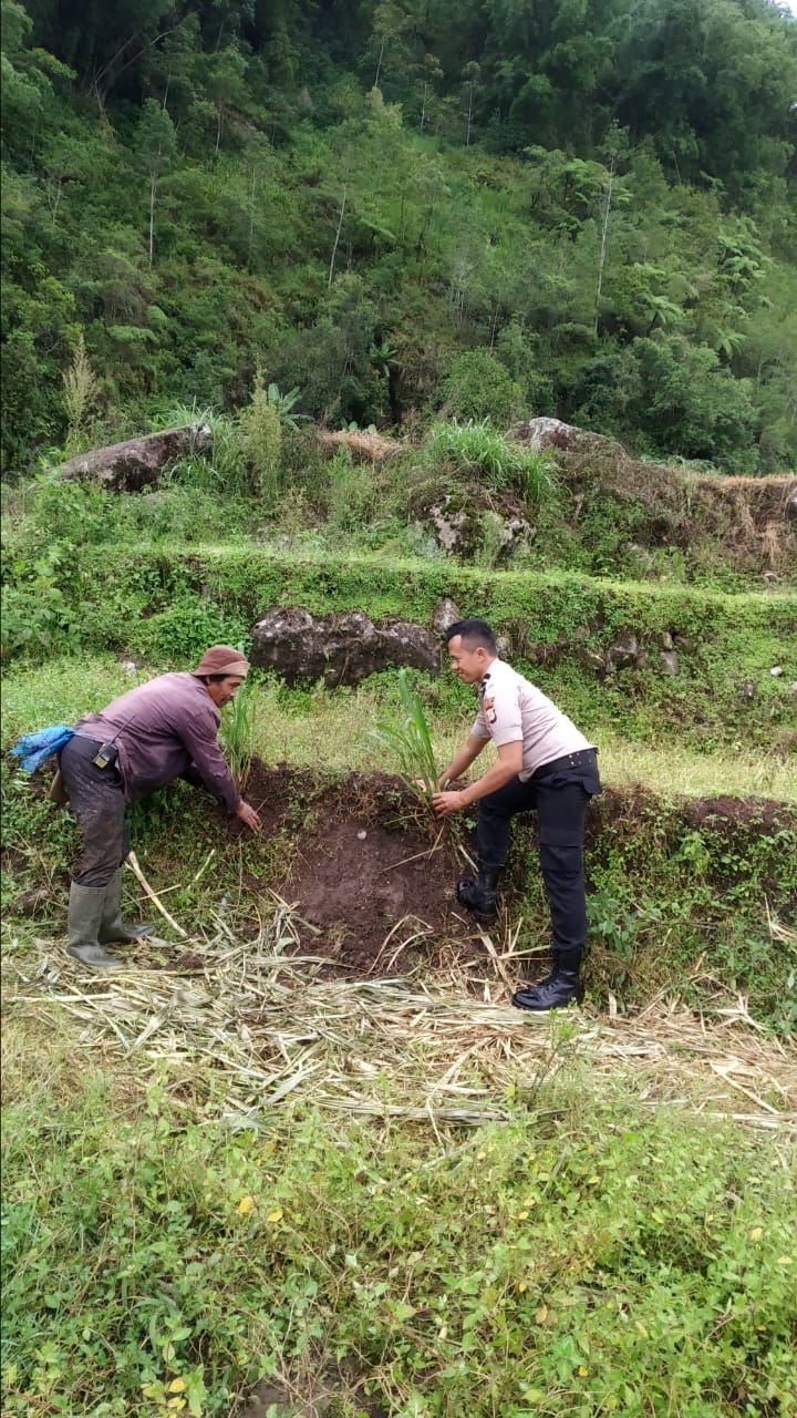 Antisipasi Longsor, Bhabinkamtibmas Bersama Warga Tanam Rumput