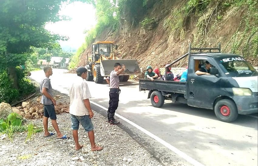 Untuk memperlancar arus lalu lintas di jalur poros Malino-Sungguminasa, Kabupaten Gowa, Bhabinkamtibmas Desa Lonjoboko Aiptu Jusman Tayeb bersama-sama warga setempat membersihkan material tanah longsor yang menghalangi bahu jalan, Senin (20/01/2020).