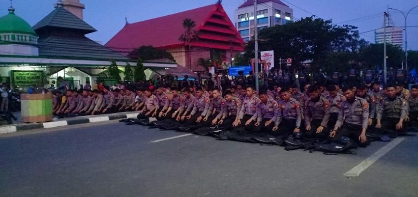 Di tengah menjalankan tugasnya dalm mengamankan kondisi, agar demonstrasi berjalan aman dan tertib, aparat kepolisian selaku umat beragama, tetap melaksanakan ibadah sholat.