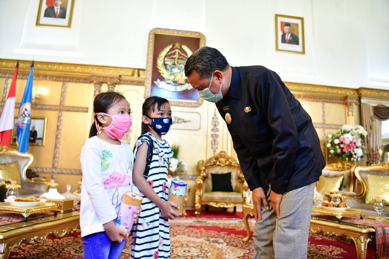 Dua orang anak asal Lamongan, Jawa Timur, menyumbangkan celengannya untuk penanganan Covid-19, yang diterima langsung Gubernur Sulawesi Selatan (Sulsel, Prof HM Nurdin Abdullah di Rujab, Senin (20/4/2020).