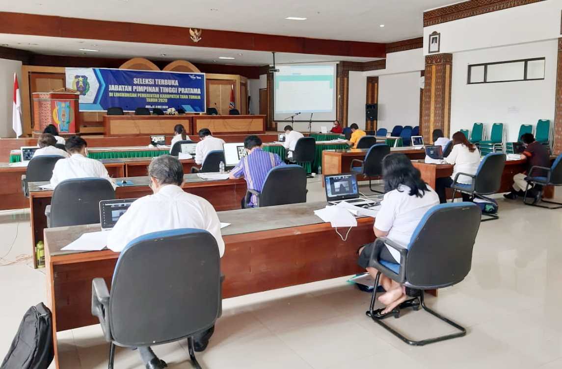 Pelaksanaan seleksi terbuka JPT Pratama itu dilakukan di tengah pandemi Covid-19. Para peserta diberi jarak yang cukup jauh satu sama lain dan semua mengenakan masker. Pelaksanaan seleksi di Ruang Pola Kantor Bupati Tana Toraja.