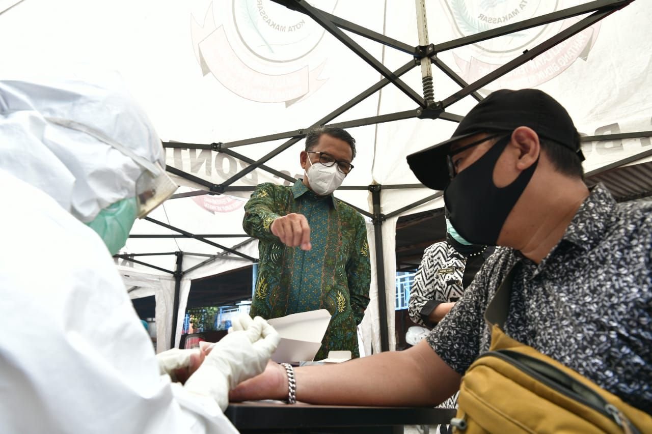 Gubernur Sulsel yang didampingi pejabat terkait ikut menyaksikan proses rapid test bagi seluruh pedagang di Pasar Terong. Sebelumnya, ia juga sudah melihat langsung proses rapid test massal di Pasar Sentral Makassar.
