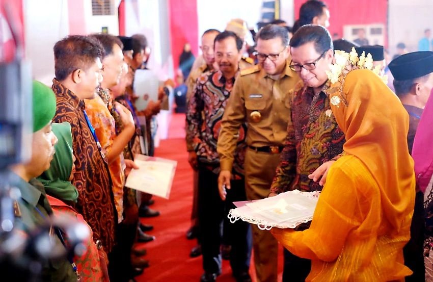Gubernur Sulawesi Selatan, Prof H M Nurdin Abdullah serahkan sertifikat tanah sebanyak 3.000 untuk rakyat, di Lapangan Tennis Indoor PT Telkom, Jalan Andi Pangeran Pettarani, Makassar, Senin 2 Desember 2019.