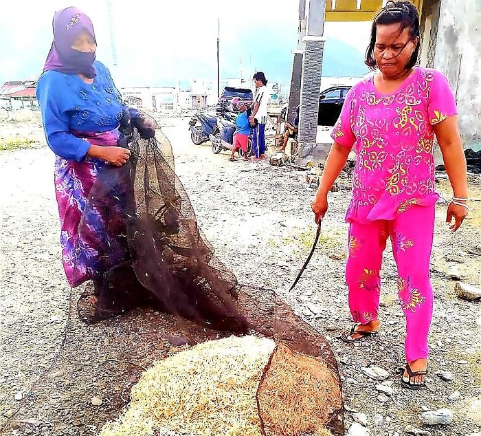 “Umur saya sudah 65 tahun, tetapi saya masih kuat menarik jala. Pekerjaan ini sudah saya lakukan sejak muda. Jadi sudah terbiasa,” cerita Emi ketika ditemui di bagian barat jembatan kuning yang dirusak gempa dan tsnunami, 28 September 2018, Senin (21/09/2020) siang.