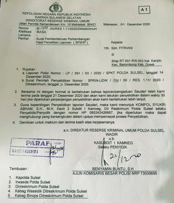 Surat Pemberitahuan Perkembangan Hasil Penelitian Laporan (SP2HP) yang diberikan kepada pelapor Fitriani
