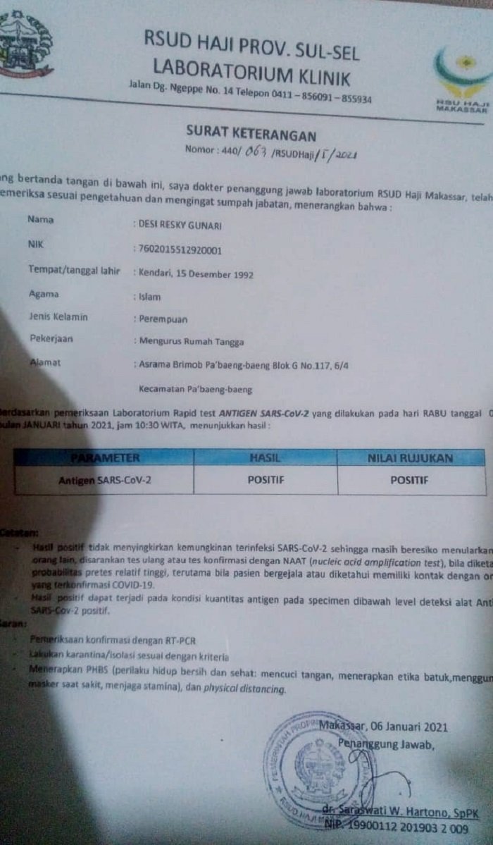 Surat keterangan tertanggal 06 Januari 2021 yang ditandatangani dr Saraswati W. Hartono selaku Penanggung Jawab Laboratorium Klinik RSUD Haji Provinsi Sulsel, diakui sumber itu sudah dikonfirmasikan oleh beberapa korban penipuan ke pihak RSUD Haji Provinsi Sulsel yang kemudian membantah kebenaran surat keterangan tersebut. (tim)