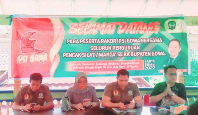 Pengurus Dewan Pengurus Daerah (DPD) Ikatan Pencak Silat/Manca Indonesia (IPSI) Kabupaten Gowa bersama pengurus se-Kabupaten Gowa menggelar Rapat Koordinasi (Rakor) di Caffe Mario, Kelurahan Tombolo, Kecamatan Sombaopu, Gowa, Sabtu (28/05/2022).
