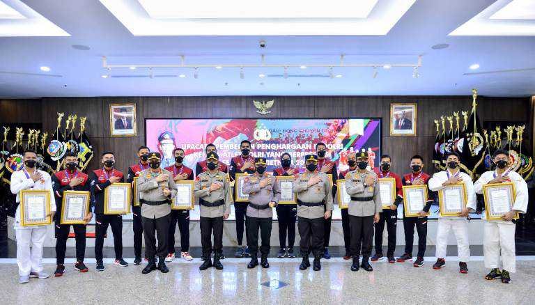 Kapolri Jenderal Listyo Sigit Prabowo memberikan penghargaan sebagai bentuk apresiasi kepada personel Polri sebagai atlet yang telah menyumbangkan medali emas, perak dan perunggu untuk Indonesia dalam perhelatan Sea Games Vietnam.